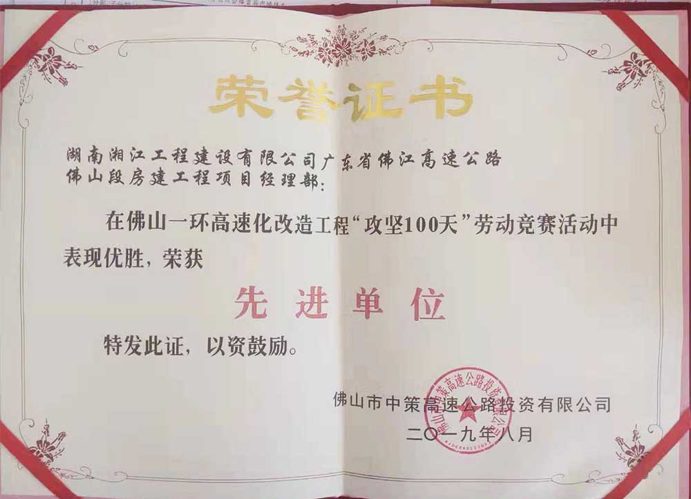 自進場以來,項目部面對工期緊、任務重的困難,多次優化施工方案。在此次“攻堅100天”勞動競賽中,項目部上下一心、攻堅克難,合理利用時間加強調度,在過程中不斷總結經驗,最終圓滿完成了任務目標,獲得佛山市中策高速公路投資有限公司的表彰。