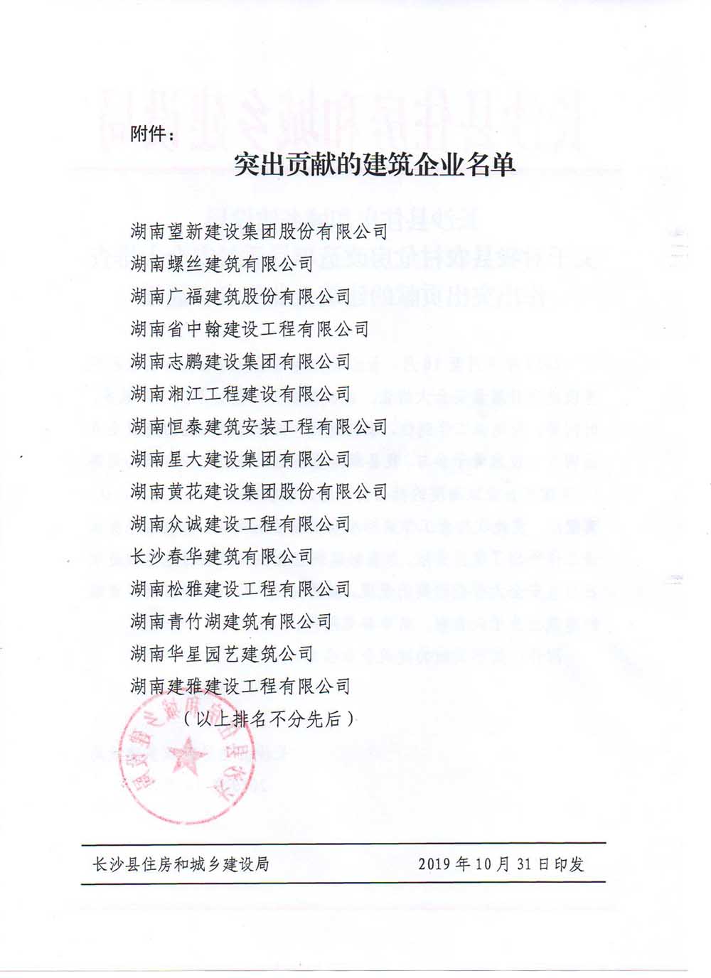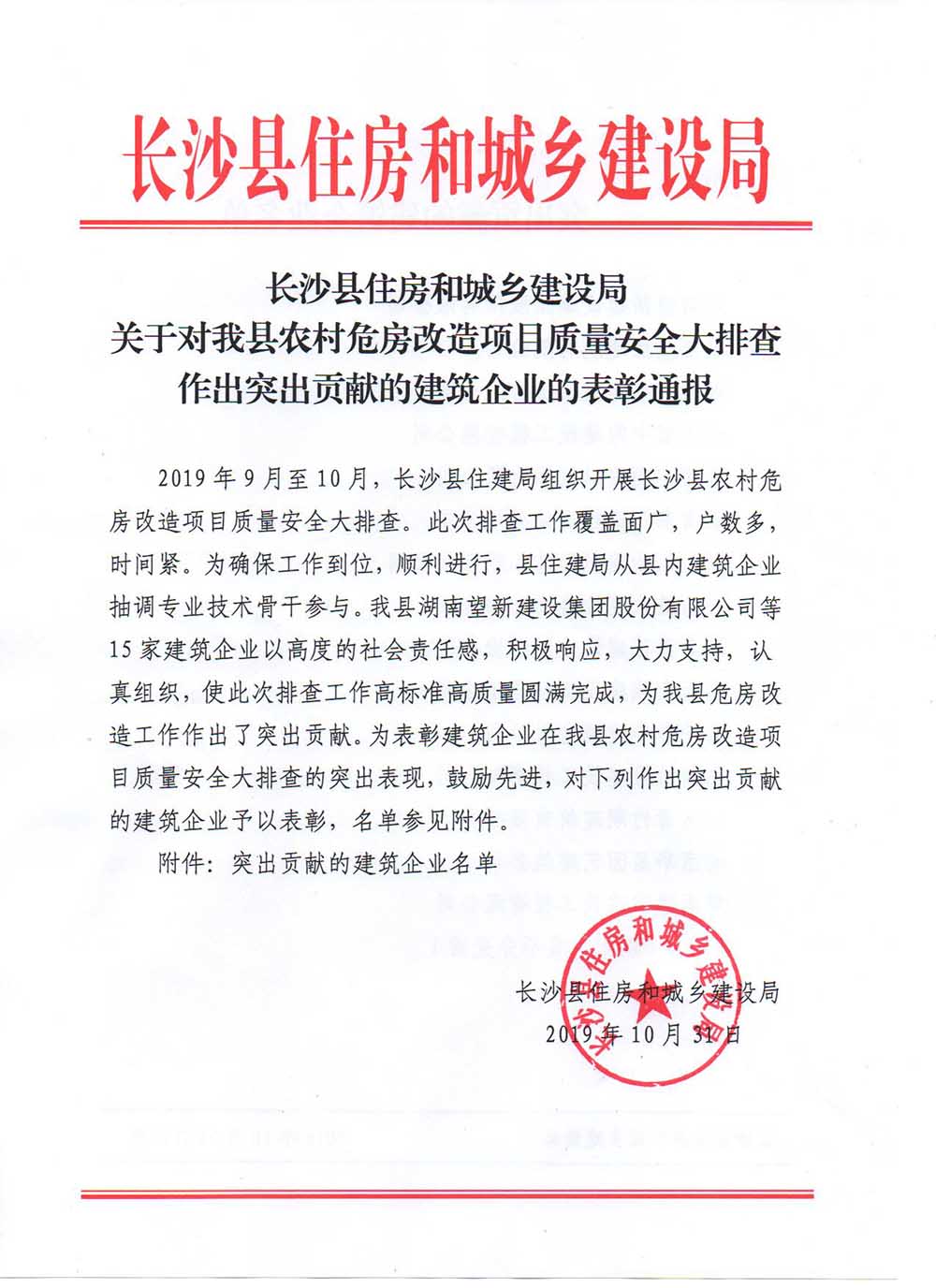 2019年10月31日,長沙縣住房和城鄉(xiāng)建設局印發(fā)《關于對我縣農(nóng)村危房改造項目質量安全大排查作出突出貢獻的建筑企業(yè)的表彰通報》,湘江公司作為獲表彰企業(yè)位列其中。
